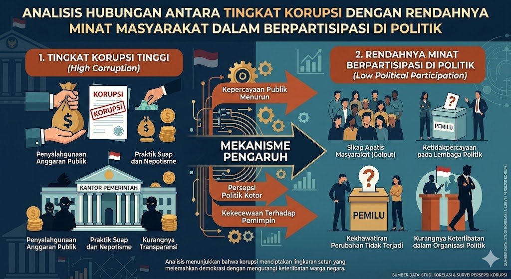 Fenomena korupsi yang mengakar dalam birokrasi dan lembaga politik suatu negara sering kali menjadi faktor utama yang merusak tatanan demokrasi. Hubungan antara praktik korupsi dan tingkat partisipasi politik masyarakat bersifat simbiotis namun destruktif. Ketika integritas para pemangku kebijakan dipertanyakan, kepercayaan publik sebagai fondasi demokrasi perlahan mulai runtuh. Kondisi ini menciptakan persepsi di tengah masyarakat bahwa keterlibatan mereka dalam proses politik, baik melalui pemungutan suara maupun aspirasi publik, tidak lagi memiliki kekuatan untuk membawa perubahan yang nyata.